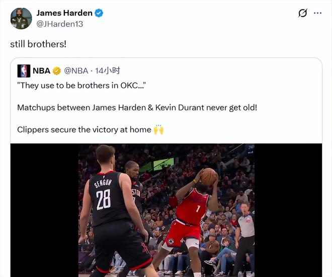快船在此前的比賽中128-108戰(zhàn)勝火箭。NBA官方社媒播放了兩人對決的畫面,并配文寫道:“‘他們以前在俄克拉荷馬城是兄弟……’哈登和杜蘭特的對決永遠不會讓人厭倦!快船隊主場取勝?!惫潜救宿D發(fā)了這段視頻并配文:“現在依然是兄弟!”