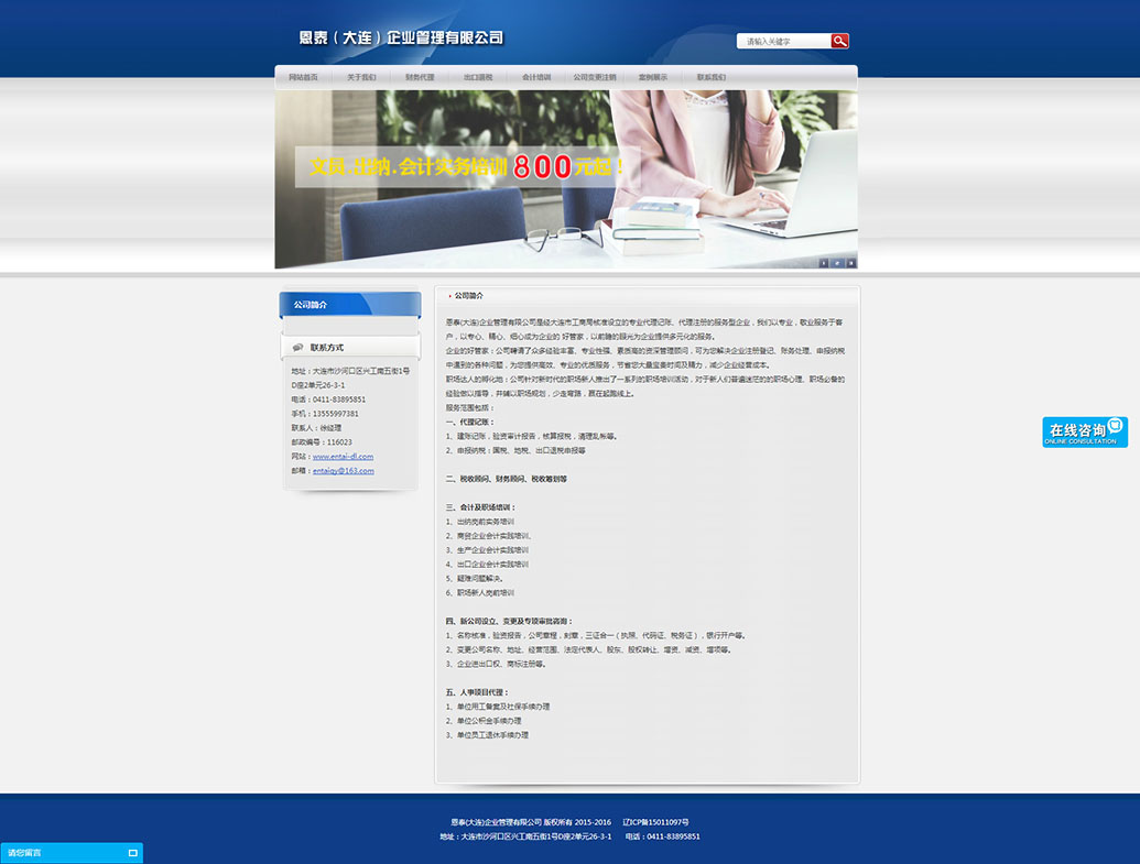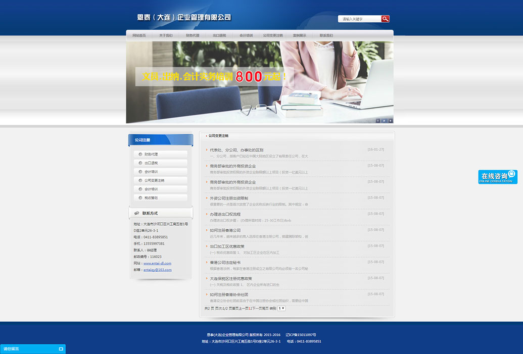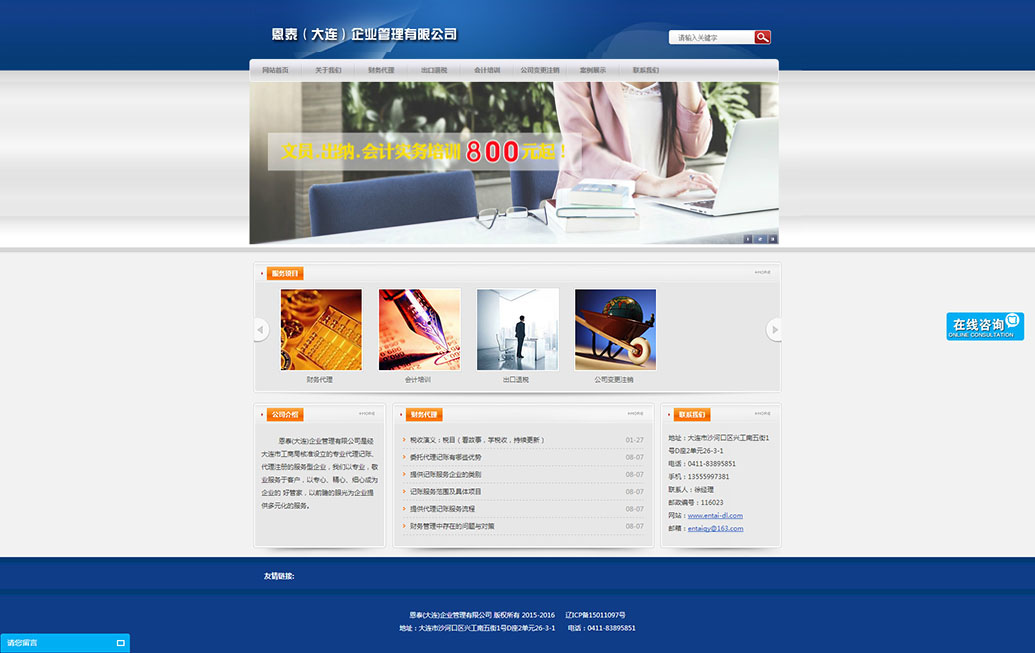 恩泰(大連)企業(yè)管理有限公司是經(jīng)大連市工商局核準(zhǔn)設(shè)立的專業(yè)代理記賬、代理注冊(cè)的服務(wù)型企業(yè),我們以專業(yè),敬業(yè)服務(wù)于客戶,以專心、精心、細(xì)心成為企業(yè)的 好管家,以前瞻的眼光為企業(yè)提供多元化的服務(wù)。企業(yè)的好管家:公司聘請(qǐng)了眾多經(jīng)驗(yàn)豐富、專業(yè)性強(qiáng)、素質(zhì)高的資深管理顧問(wèn),可為您解決企業(yè)注冊(cè)登記...