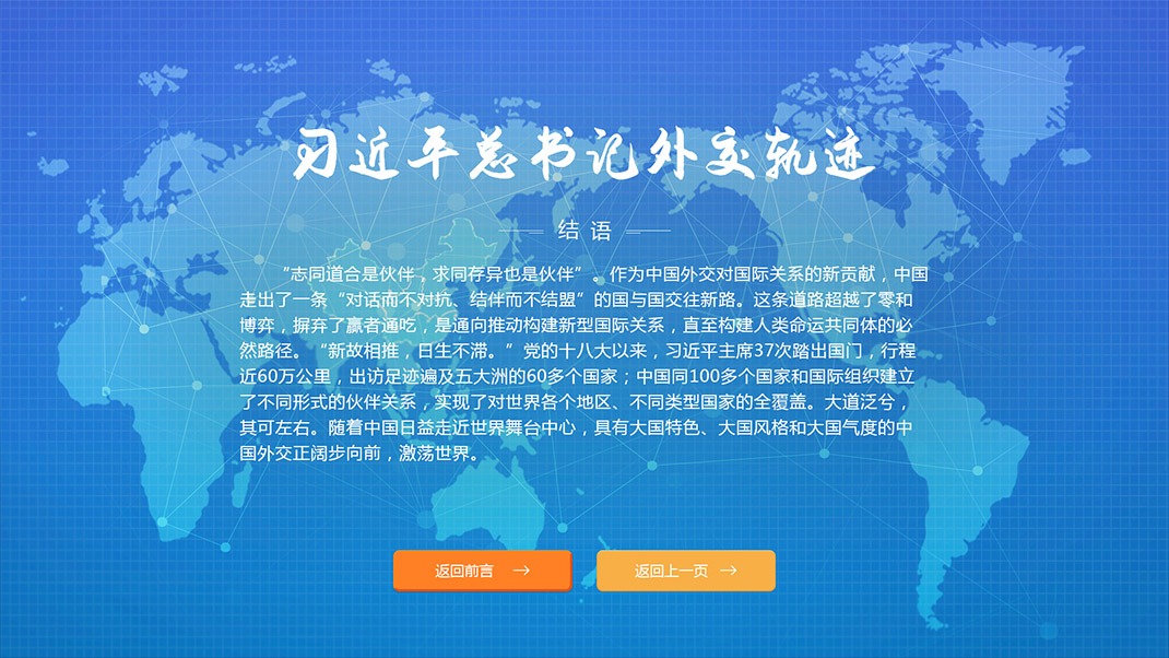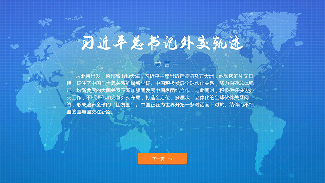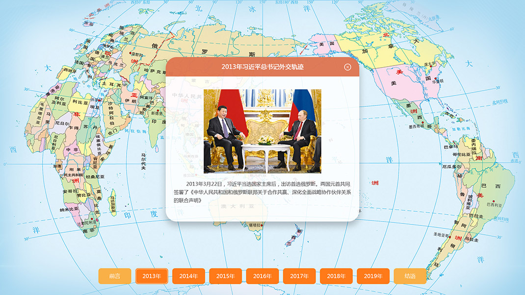 大連理工大學(xué)觸屏系統(tǒng)由大連仟億科技有限公司進(jìn)行開發(fā),主要包括兩個系統(tǒng),第一個為一帶一路,第二個為大國外交,習(xí)近平主席出訪足跡遍及五大洲,他頻密的外交日程,標(biāo)注了中國與世界關(guān)系的嶄新坐標(biāo)。中國積極發(fā)展全球伙伴關(guān)系,努力構(gòu)建總體穩(wěn)定、均衡發(fā)展的大國關(guān)系不斷…