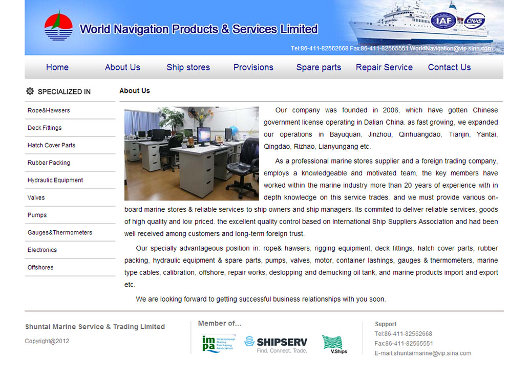 順泰船舶服務(wù)(大連)有限公司是一家私營企業(yè),公司成立于2010年1月1日,公司主營船舶配件,船舶物資及伙食的銷售補給,輸出船舶的現(xiàn)場維修以及貨物,技術(shù)進出口。