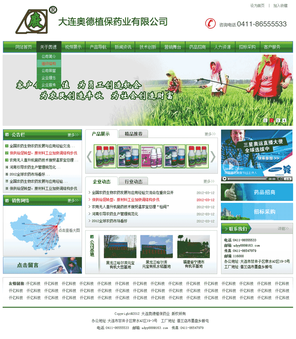 大連奧德植保藥業(yè)有限公司是國(guó)家發(fā)改委核準(zhǔn)的農(nóng)藥定點(diǎn)企業(yè).主要從事有機(jī)農(nóng)藥及綠色、無(wú)公害的植物源、微生物源、海洋生物源等殺蟲(chóng)劑、殺菌劑、抗病毒劑和生物肥料的生產(chǎn)??偣粳F(xiàn)有兩個(gè)農(nóng)藥定點(diǎn)企業(yè),一個(gè)生物研究所和六個(gè)植物醫(yī)院構(gòu)成...