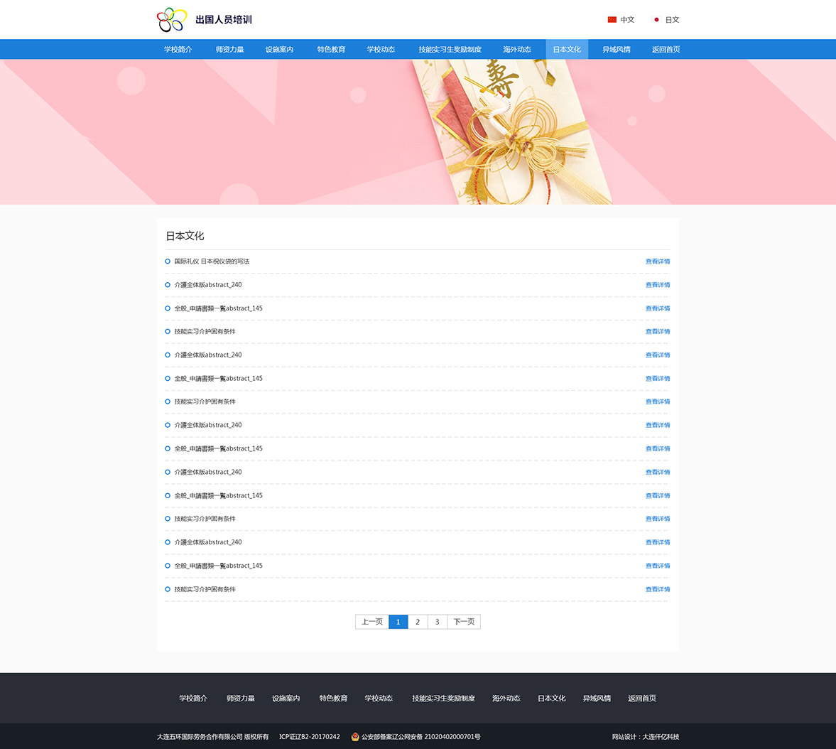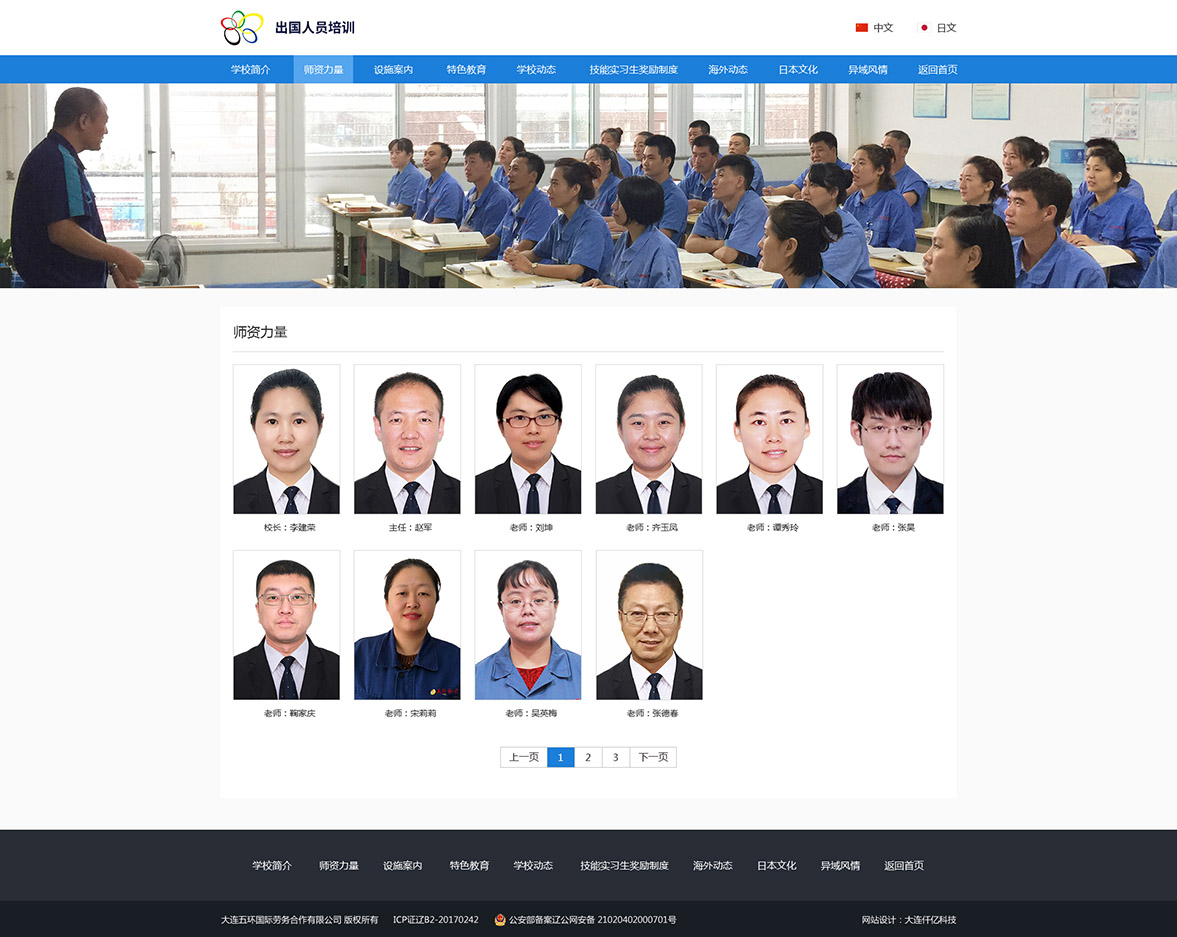 我校正式成立于2012年4月1日,是經(jīng)大連市對外貿(mào)易經(jīng)濟合作局認證專業(yè)從事外派勞務培訓的機構。全校共有校長、外籍教員、教導主任、日本語教師等10余名教職員工,可共同容納5個班級、約200人同時開班培訓。學校還擁有多媒體教室、圖書館、縫紉考核室、電焊考核室、日本文化展覽室以及腳手架、模板、噴漆等各類考核工具,總占地面積約7000平方米 。