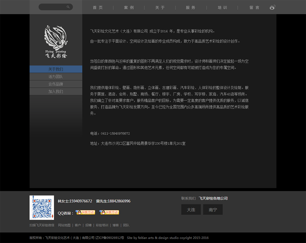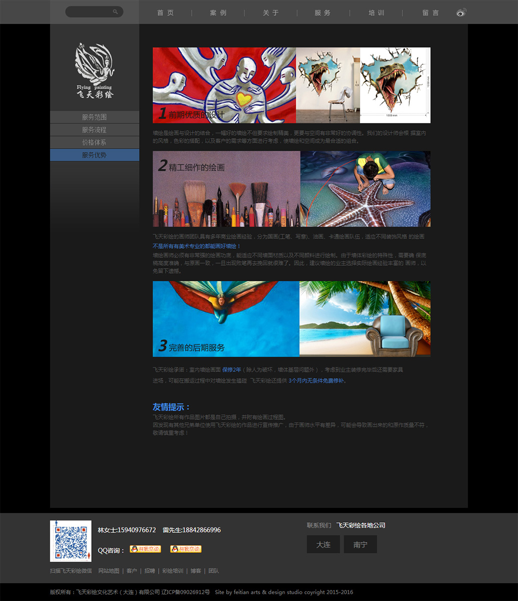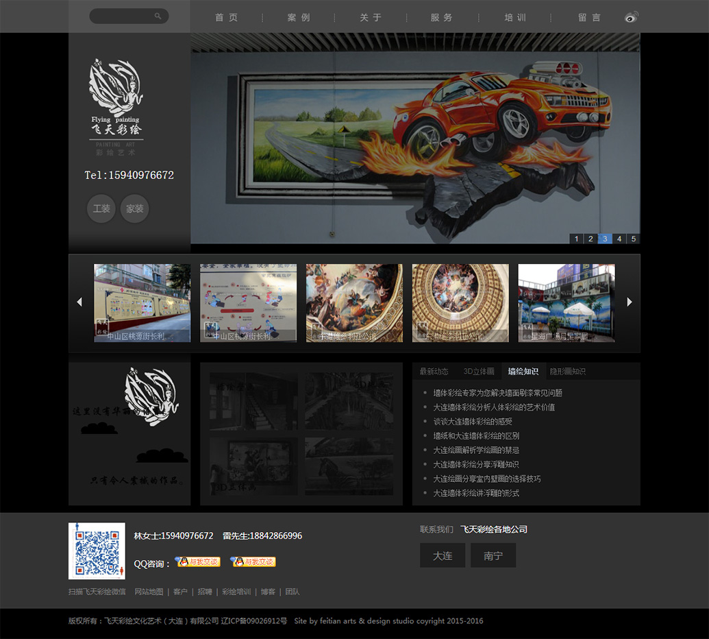 飛天彩繪文化藝術(shù)(大連)有限公司 成立于2014 年,是專(zhuān)業(yè)從事彩繪的機(jī)構(gòu)。由一批專(zhuān)注于平面設(shè)計(jì)、空間設(shè)計(jì)及繪畫(huà)的專(zhuān)業(yè)成員構(gòu)成,致力于高品質(zhì)藝術(shù)彩繪的設(shè)計(jì)創(chuàng)作。我們提供墻體彩繪、壁畫(huà)、隱形畫(huà)、立體畫(huà)、古建彩畫(huà)、汽車(chē)彩繪、人體彩繪的整體設(shè)計(jì)及繪制...