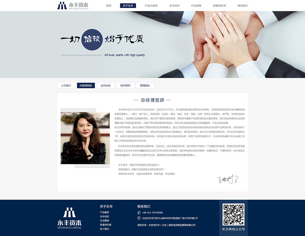 永安信億豐(大連)股權(quán)投資基金管理有限公司(簡稱“永豐資本”)于2011年3月成立,總部位于大連,是國內(nèi)首批通過中國證券投資基金業(yè)協(xié)會(huì)備案登記(備案編號(hào)為P1002785)并獲得基金冠名的專業(yè)私募股權(quán)投資管理公司。公司以“客戶至上,財(cái)富共贏”為目標(biāo),為客戶提供卓越的財(cái)富管理服務(wù),致力于成為國內(nèi)頂尖的......